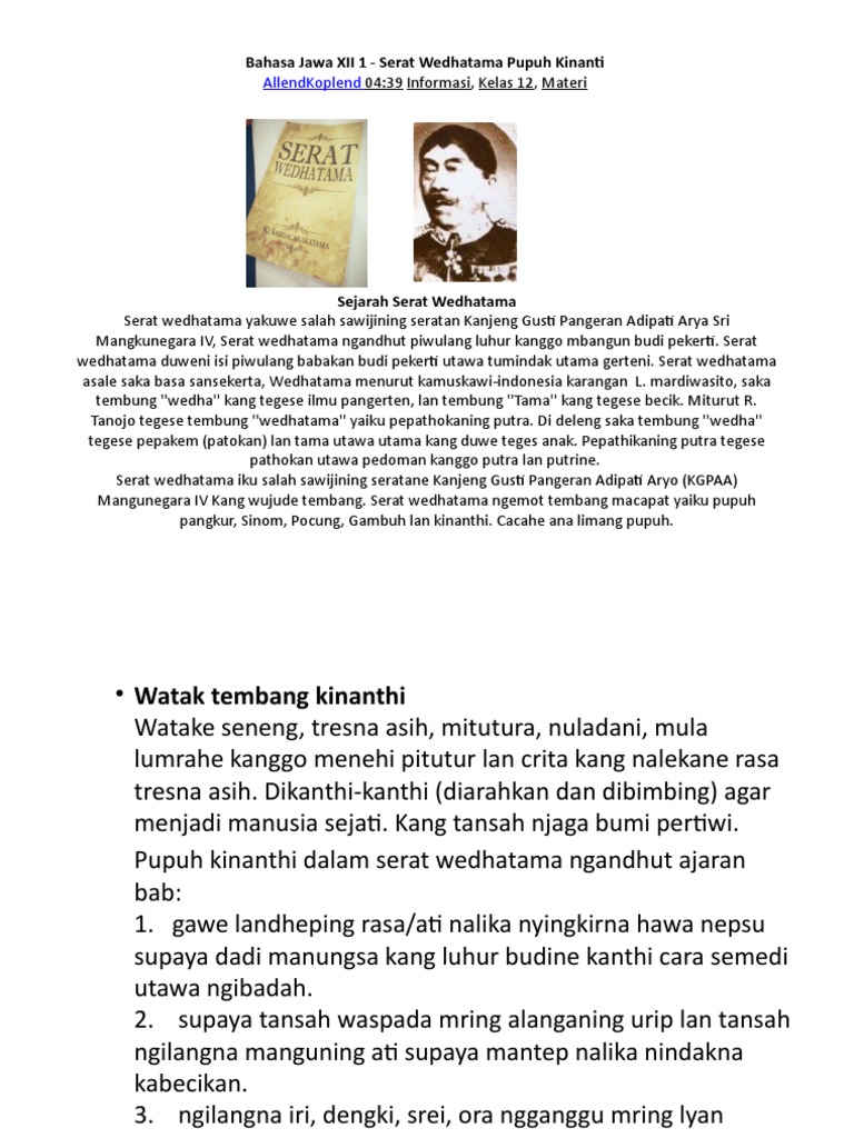 Saka pada kang wis dijarwakake dadi basa indonesia mau bisa ditemokake tuntunan ing urip, upamane: Materi pembelajaran serat wedhatama pupuh pocung Oleh karena itu, wahai anak muda sekalian.